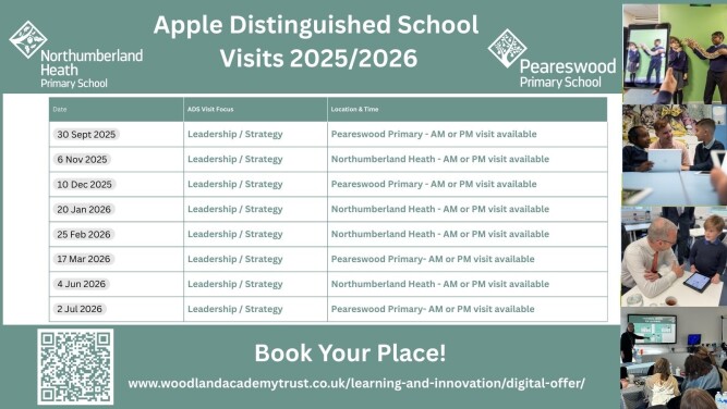 Northumberland Heath and Peareswood Primary are hosting visits to their schools during 2025-2026 to give educators authentic insight into how purposeful use of Apple technology is transforming teaching and learning at an Apple Distinguished School.