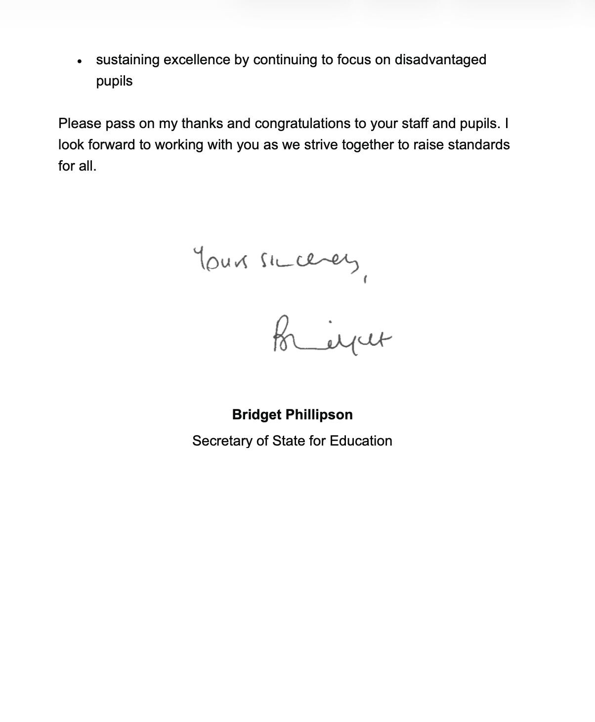 In a letter addressed to Headteacher Carla Ferla, the Secretary of State praised the school’s performance, placing Peareswood among the very best nationally and highlighting the dedication of staff and the hard work of pupils. The letter also recognises the school’s role in sharing effective practice and supporting wider system improvement.